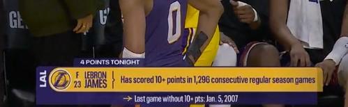 本場比賽,湖人球星詹姆斯表現(xiàn)平平,他出場31分14秒,10投3中僅得10分3助攻3失誤2犯規(guī),正負(fù)值為-6。值得一提的是,在前三節(jié)中,詹姆斯總共才得到6分,而他已經(jīng)連續(xù)1296場常規(guī)賽保持得分上雙,上一次常規(guī)賽得分為個位數(shù)還要追溯到2007年1月5日。